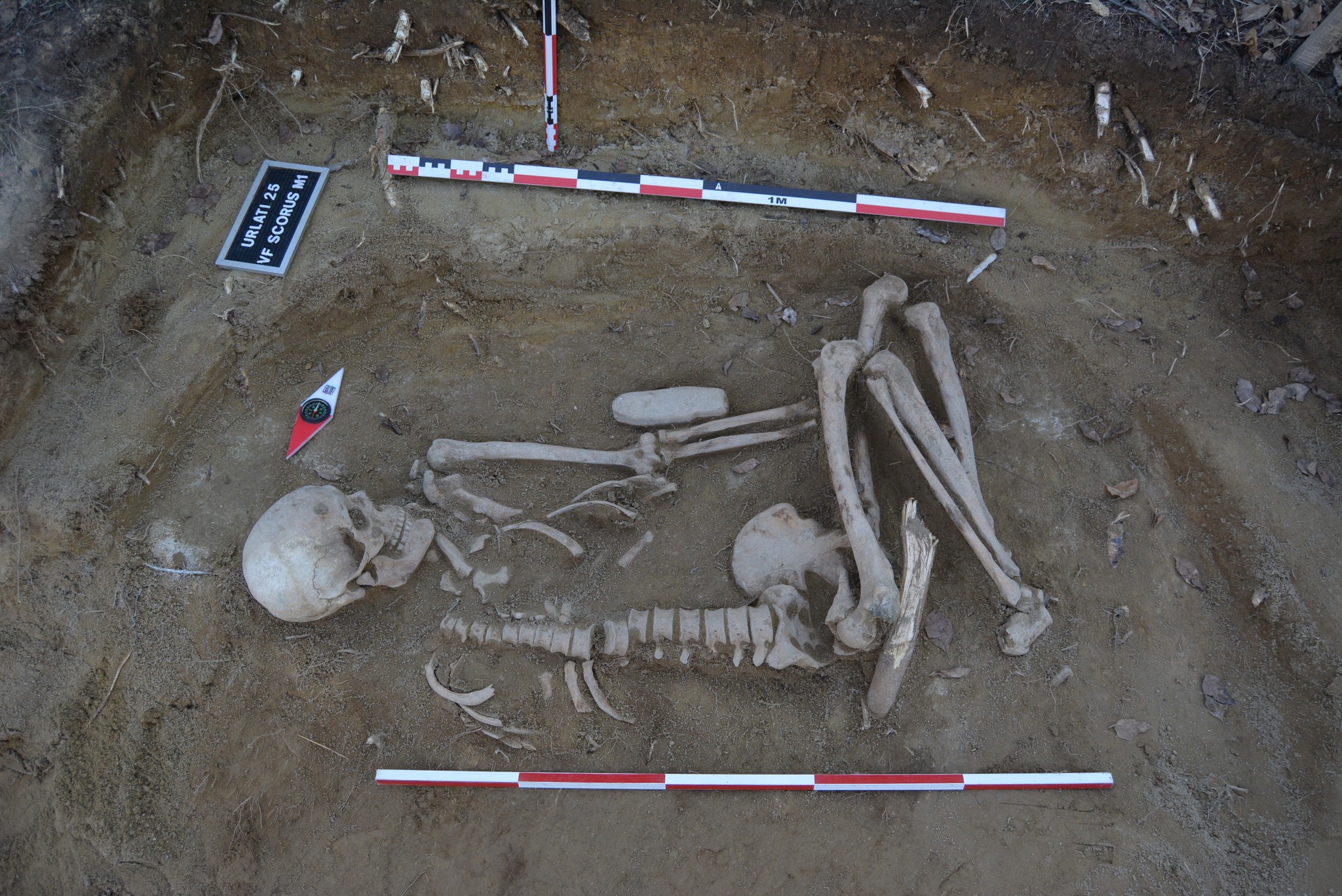 În martie, o echipă de arheologi, formată din Alin Frînculeasa, Octav Negrea și Eduard Ghinea, a cercetat zona, descoperind un schelet uman parțial prăbușit, cu o stare de conservare excepțională. Mormântul, datat la aproximativ 5.000 de ani, aparține unui bărbat adult și a fost depus conform tradițiilor preistorice. Lângă brațul stâng al defunctului a fost găsită o piesă de piatră, posibil un topor, și fragmente ceramice ce indică o locuire mai veche.