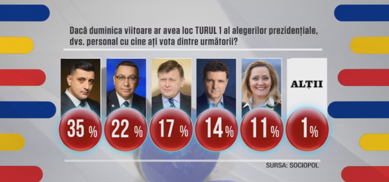 Potrivit unui sondaj realizat de Sociopol la comanda România TV, George Simion, liderul AUR, conduce detașat în intențiile de vot pentru primul tur al alegerilor prezidențiale, cu 35% din opțiuni. Pe locul al doilea se află fostul premier Victor Ponta, cu 22%.